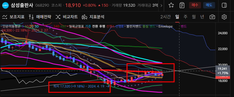 삼성출판사는 4월19일 17320원이후 5일선을 회복하며 상승세를 보이고 있다.