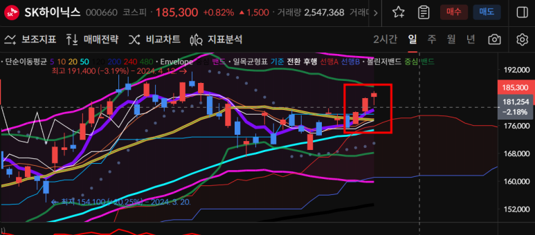 sk텔레콤은 4일연속 상승세를 보이며 이번엔 볼린저밴드상단의 위치를 이어가고 있다.