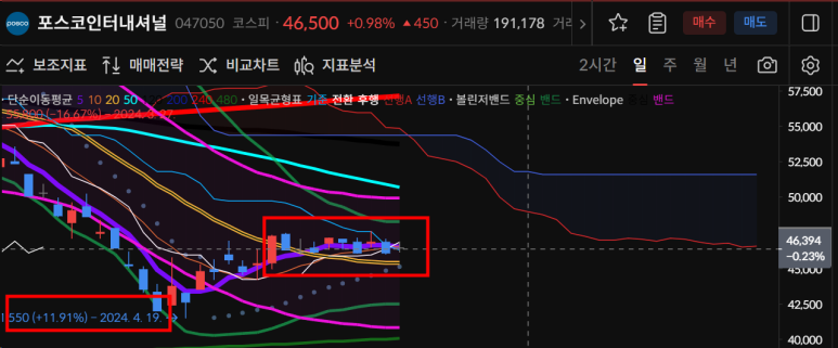 포스코인터내셔널은 4월19일 저점후 5일선 회복을 하며 20일선까지 돌파를 했다.