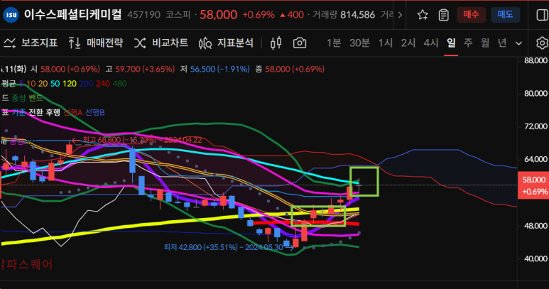 이수스페셜티케미컬도 레이크머티리얼즈처럼 120일선을 돌파하며 엔벨로프상단, 50일선을 돌파할 수 있는 상승세를 기대할 수 있게 되었다.