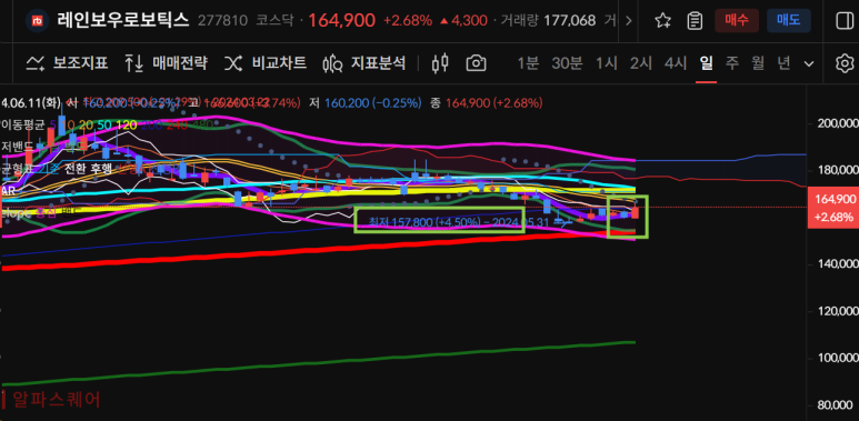 레인보우로보틱스는 157800원 이후 5일선을 회복하면서 유지중으로 오늘은 20일선 이전까지 회복하며 이제는 20일선을 돌파하는 상승세를 기대할 수 있게 되었다.