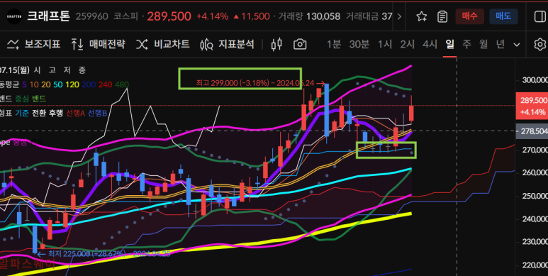 크래프톤은 299000원이후 저점을 지지하며 다시 전고점을 향해 올라가는중이다.