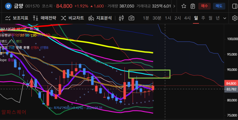 에코프로 시리즈중 유일하게 양봉으로 마감한 에코프로머티는 이제 20일선,50일선5일선이 뭉쳐진상황에서 엔벨로프 상단까지 오를 수 있게 되었다.