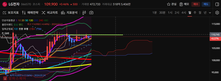 lg전자는 11만원의 저항이 강하기 때문에 일차트로는 추세를 확인할 수는 없다.