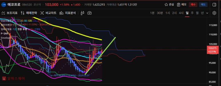 에코프로는 상승세가 지속되는 가운데 이번 상승추세에서 120일선을 회복하는 것이 가장 중요하다.