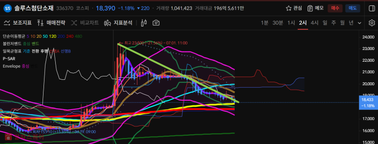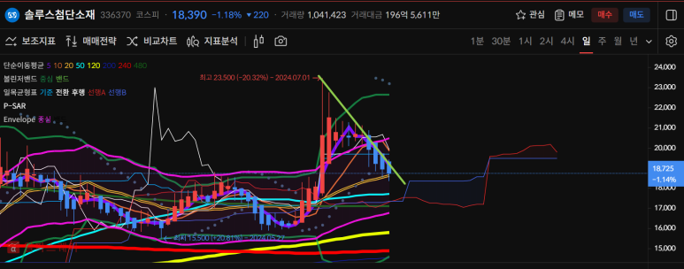 솔루스첨단소재는 23500원이후로 하락추세가 지속되면서 오늘은 20일선까지 터치한 상황이다.