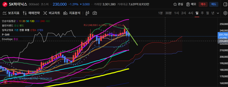 sk하이닉스는 248500원이후로 하이킨아시상 2연속 음봉이 진행되고 있는데