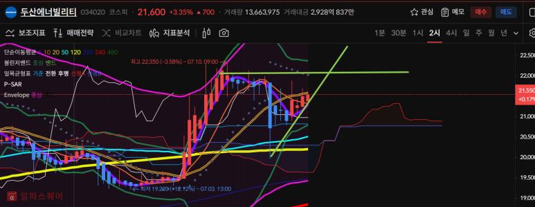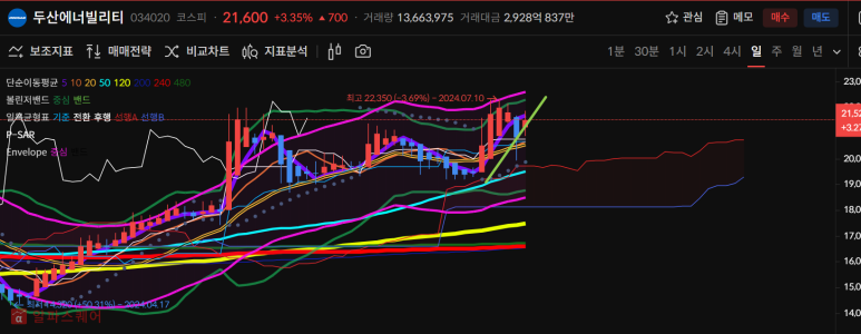 두산에너빌리티는 50일선 부근에서 나온 상승추세가 22350까지 올랐고