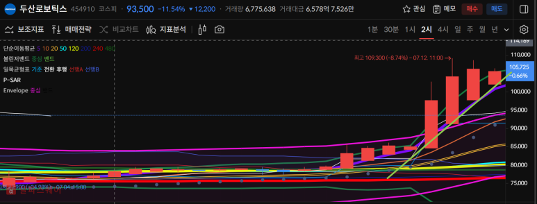 두산로보틱스는 7월12일 11시 고점 이후 15시 마감때까지 양봉으로 마감되었기 때문에 추가상승을 기대할 수도 있었다.