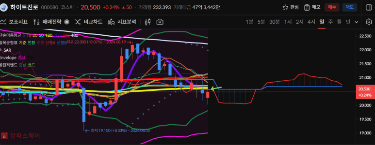 하이트진로는 22300원이후로 하락이 진행되었고 120일선을 깬 상황이 되었다.