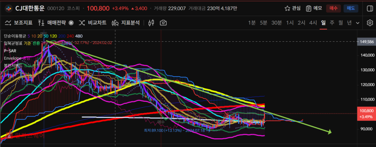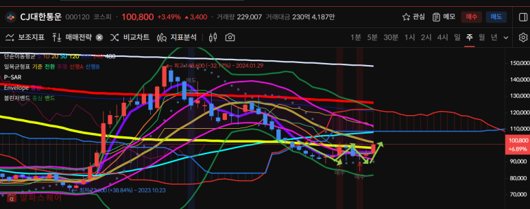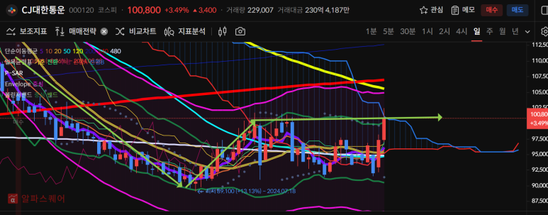cj대한통운은 오랜 하락끝에 반등이 시작되는 것을 볼 수 있다.