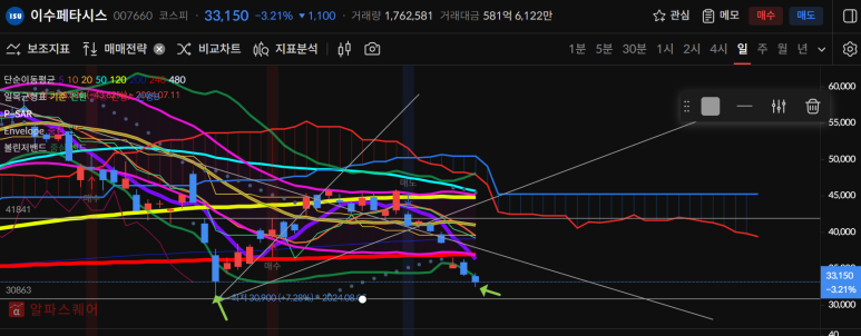 이수페타시스는 오늘도 하락을 하여 이 전 저점까지 내려갈 가능성이 생겼다.
