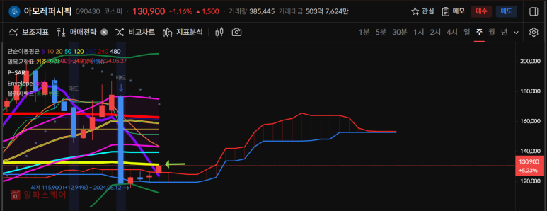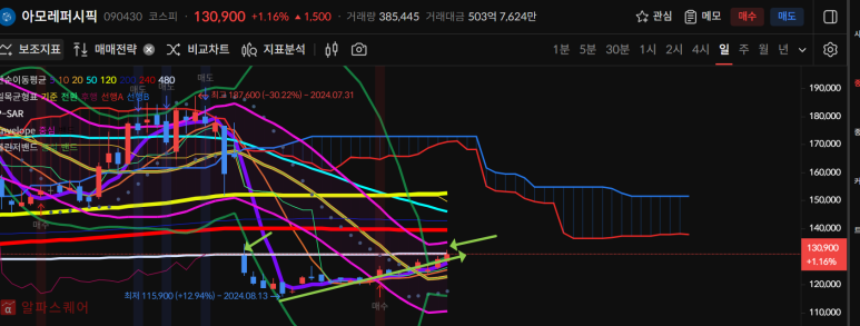 아모레퍼시픽은 갭하락 (480일선기준)이후 8월13일부터 반등이 나왔고 오늘까지 5일선을따라 상승중이다.