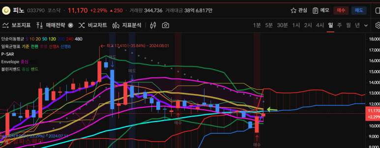 피노는 어제의 큰 상승에 이어 연속양봉을 기록하며 5일선 돌파, 20일선터치가 나왔다.