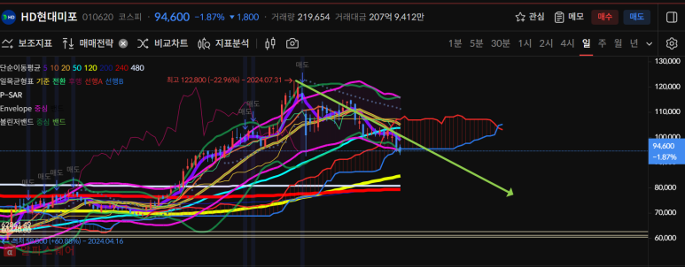 현대미포는 7월31일이후로 한번의 반등은 있었지만 이후로 하락세를 이어가고 있다.
