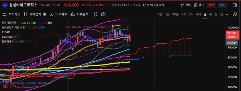 삼성바이오로직스는 1005000원이후 5일선을 깨는 하락이 나왔고 오늘 큰 양봉으로 5일선을 회복했다.