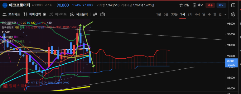 오늘 올랐다가 빠진 종목 중 대표적인 2차전지 코스피 에코프로머티는