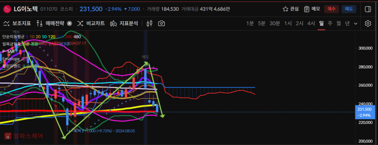 lg이노텍은 하락세가 지속되면서 4일연속 음봉을 보였다.