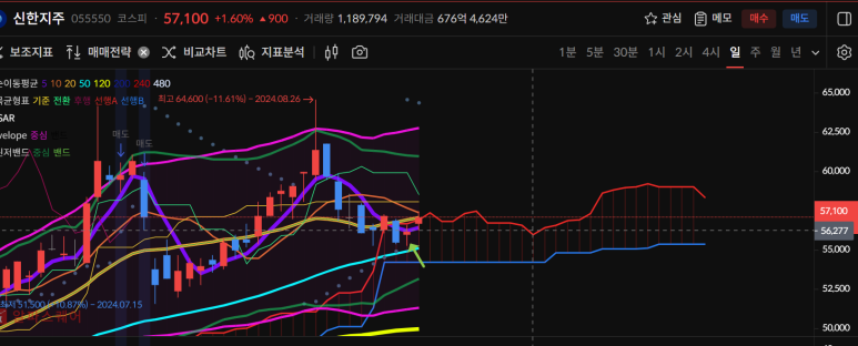 신한지주는 50일선 지지와 5일선회복 양봉 이후 오늘도 양봉이 나와서 2일연속 양봉으로 20일선까지 회복했다.