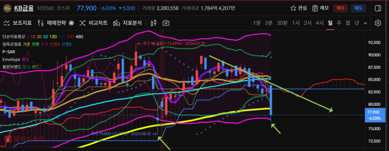 kb금융은 하락세를 이어가고 있는데 오늘은 큰 음봉으로 120일선을 깨는 차트를 남겼다.