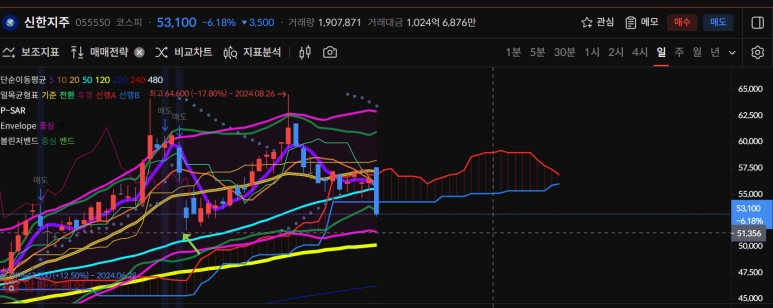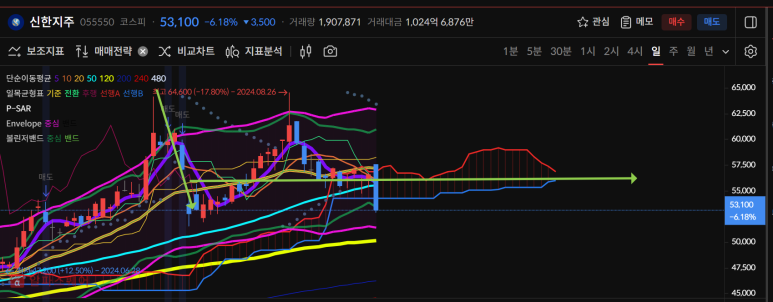 신한지주는 두 번의 고점을 기록 한뒤 하락세가 나왔고 오늘은 큰 음봉이 나왔다.