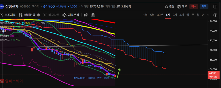 오늘 64200원까지 하락한 삼성전자는 볼린저밴드하단을 밑꼬리를 남겼다.