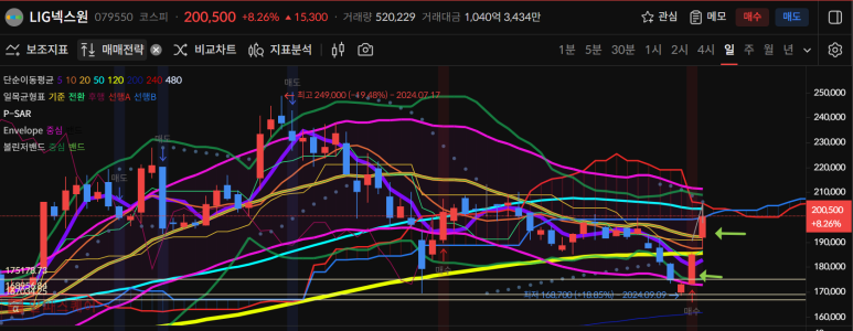 240일선을 터치하고 양봉을 기록했다는 점과 2일연속 상승을 하며 마감되었다는 점에서 상승여력이 보인다고 볼 수 있겠다.