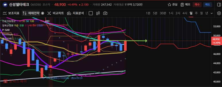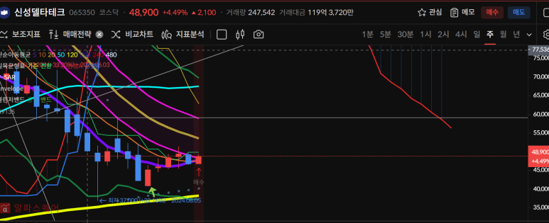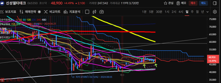 신성델타테크가 간만에 양봉마감하며 50일선을 회복했다.