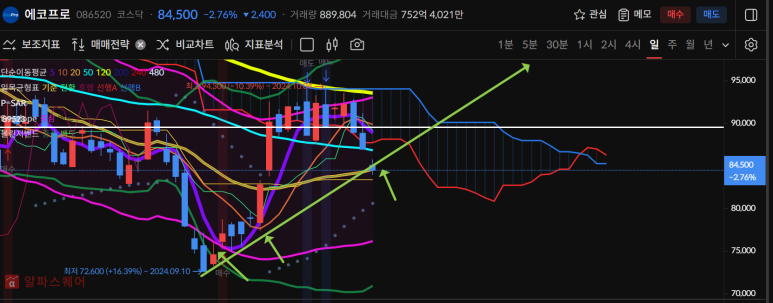 에코프로는 오늘 양봉마감으로 20일선을 지지하는 모양이 나왔어야 했는데 음봉마감이 되었으므로
