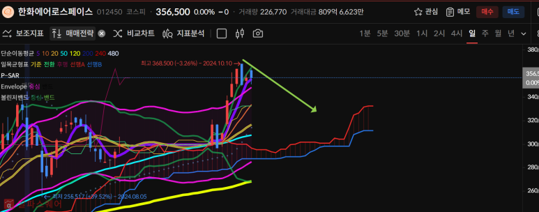 한화에어로스페이스는 긴 음봉이후로 상향에서 하향으로 추세가 끊길 것 같은 모양이 나왔다.