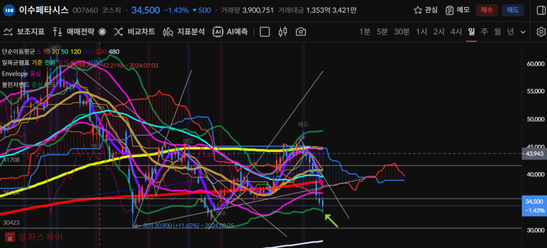 이수페타시스는 볼린저밴드 하단까지 내려왔고 이전 저점까지 온 상황이다.