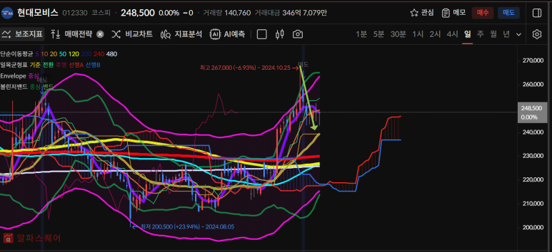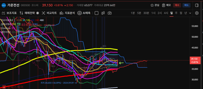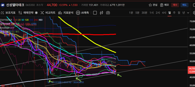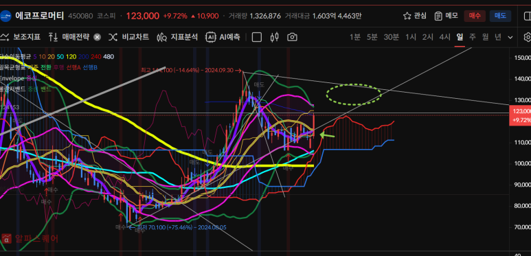 저점을 높이는 w모양에 상승추세로 120일선을 터치한 모양이다.