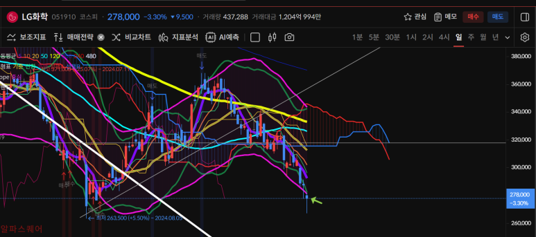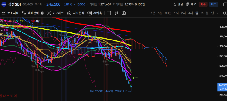 삼스디는 어제 양봉이후 추가음봉으로 저점갱신중이다.