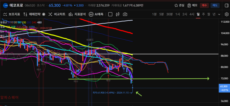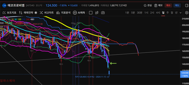 에코프로비엠은 어제 큰 음봉 이후 추가 음봉이 나왔다.