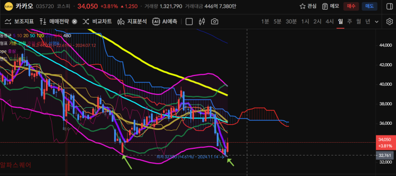 카카오는 쌍바닥 형태를 보이며 5일선을 회복하는 양봉으로 마감했다.