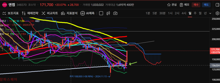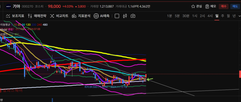 거기다 5일선과 캔들이 떨어져있는 모양이라 곧바로 올라갈 것 같진 않다.