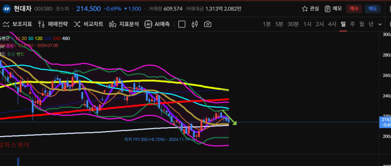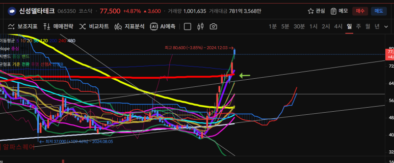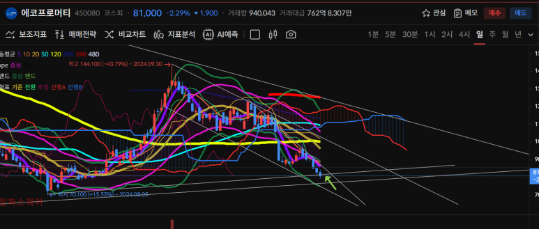 오늘은 5일선 240일선 골드크로스 후 80600원에서77500원으로 마감했다.