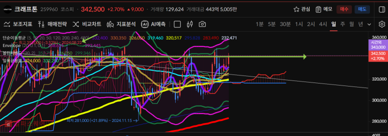 머티는 오늘 양봉으로 엔벨로프상단까지 상승했다.