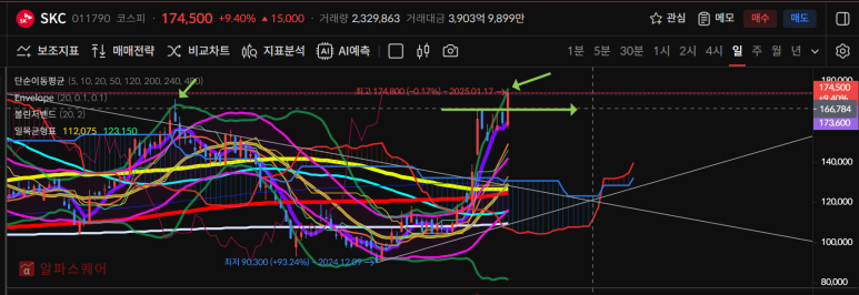 skc는 오늘 9%대상승으로 전고점과 이전고점을 돌파했다.