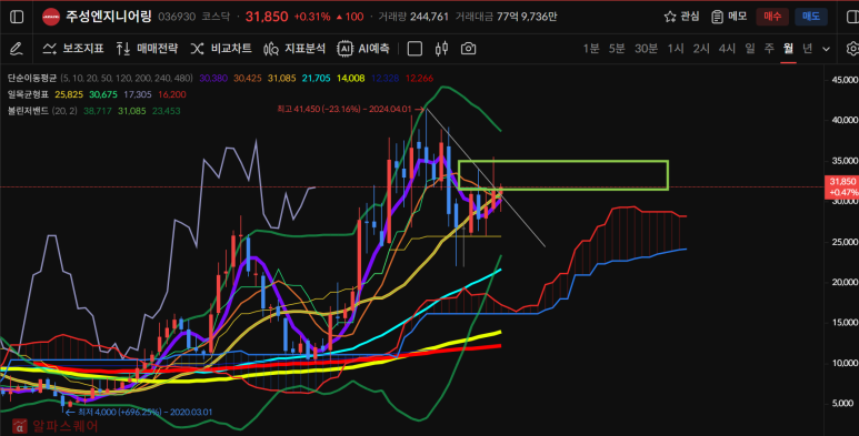 주성엔지니어링은 현재 20일선까지 회복했고 상승세를 이어나갈 듯하다.