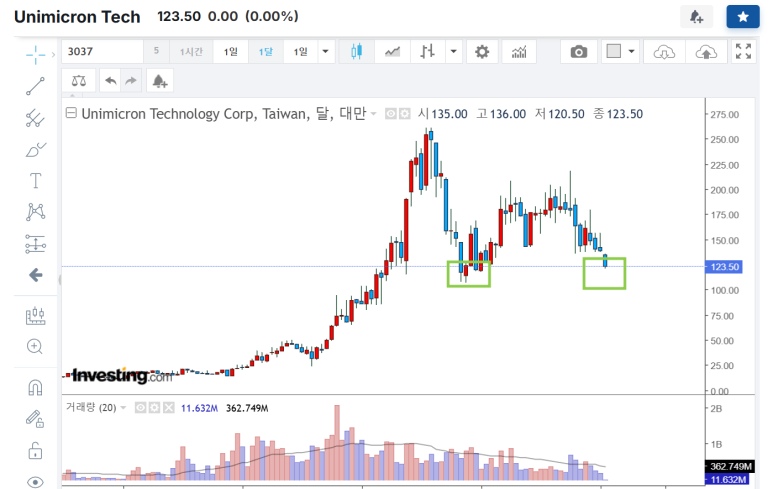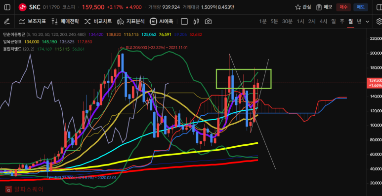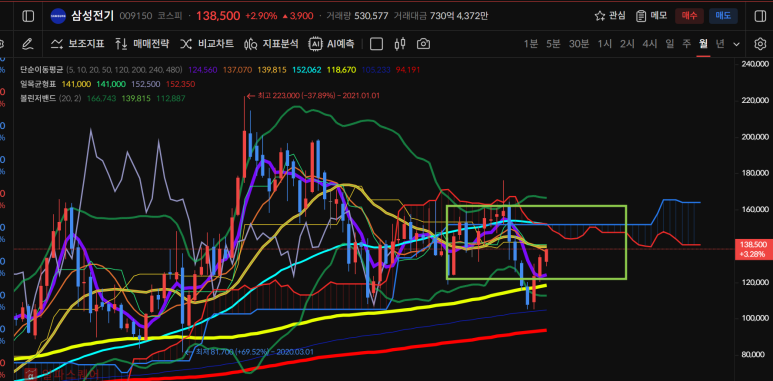 삼성전기는 현재 월차트로 20일선 회복에 가까워졌다.