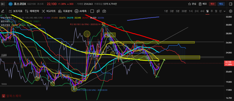 포스코dx는 볼밴하단지키는 모양에서 5일선을 돌파하며 120일선 회복을 앞두고 있다.