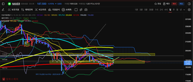 네이버는 오늘 음봉으로 20일선 저항의 모양을 보였다.