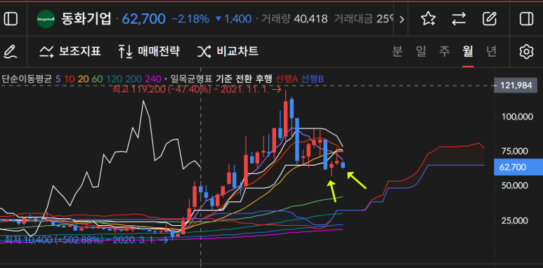 최고점 405000원을 달성하고 월봉상 240일선을 깔끔하게 터치하고 반등하고 있기 때문에