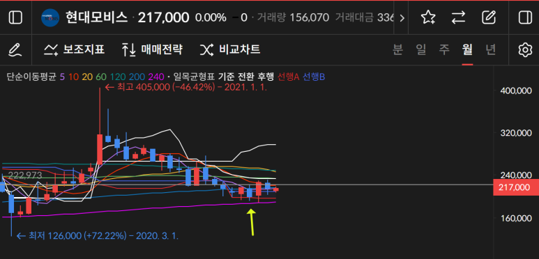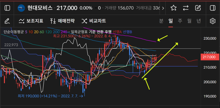 현대모비스가 예상보다 잘 오르고 있는데 반등하기 시작하면서 240일선도 내려오고 있으니