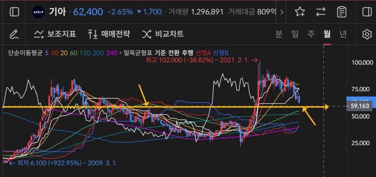 기아의 기대값은 59000원 부근에서 반등이 나오는 것이다.