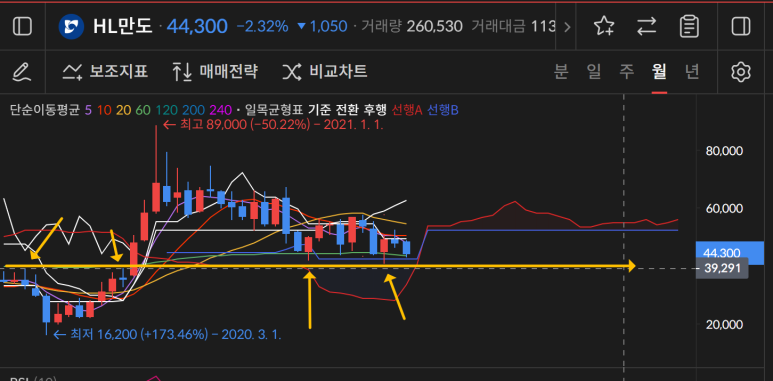 만도가 43180원부근에서 반등이 나왔는데 저항은 46000원으로 기록되었다.