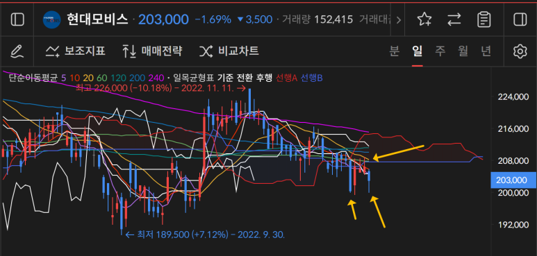 현대모비스는 20만원 이상을 계속 지켜주면서 203000원을 기록했고