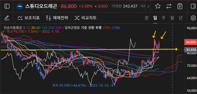 저점을 높인 w반등에다가 240일선에도 가까우니 스튜디오드래곤과 닮은 형태로 오르고 있다.