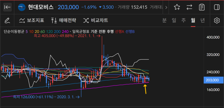 주봉상 240일선이 깨져있는 상탠데 이 차트가 깨지면 현대차는 어떤 차트를 그리게 될 지도 지켜봐야 할 것 같다.